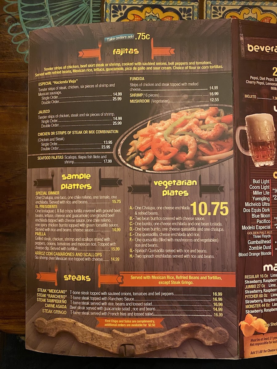 The menu at Hacienda Vieja offers a comforting and approachable taste of traditional Mexican cuisine, designed for casual dining and convenient takeout. It balances familiar favorites like burritos and enchiladas with more distinctive options such as seafood dishes featuring grilled salmon and tilapia, all served with thoughtful sides like rice, beans, and freshly made tortillas.
